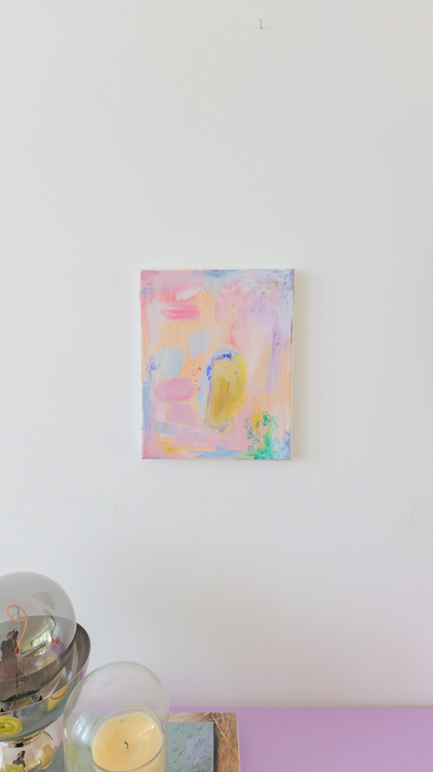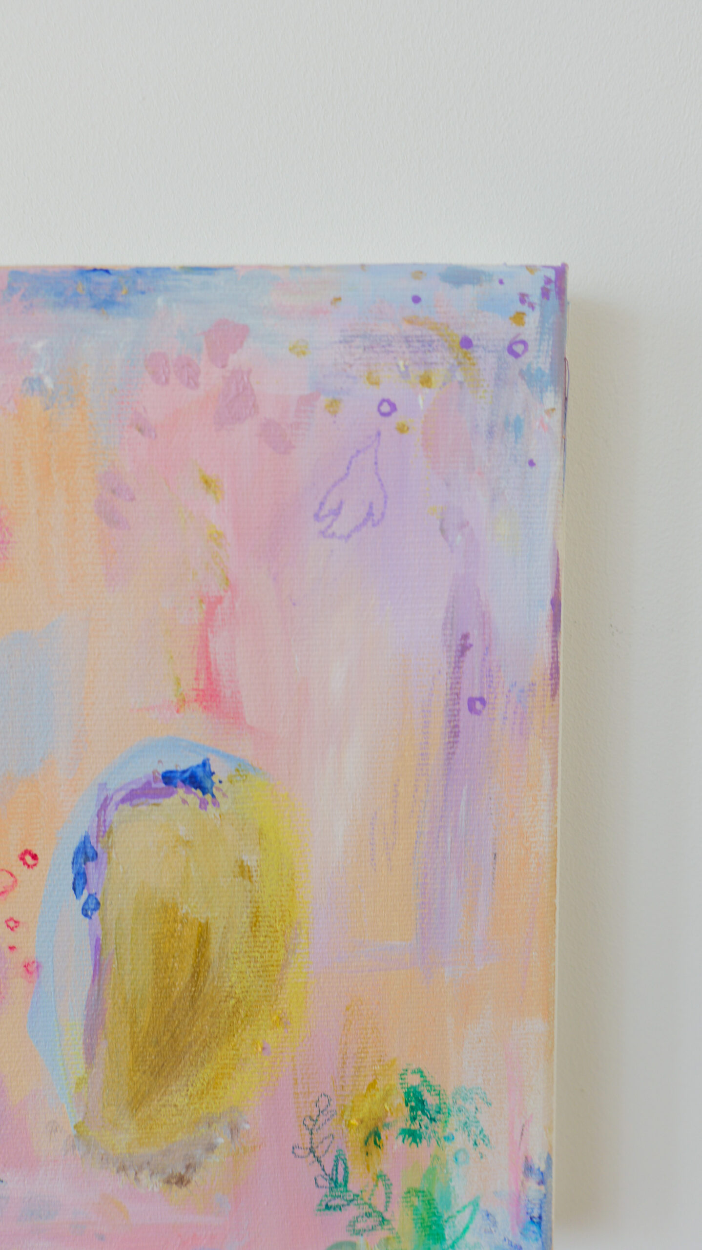 Zarte Pastelltöne in Rosa, Blau, Gelb und Grün verschmelzen auf der Leinwand zu einer sanften, träumerischen Komposition, die Ruhe und Inspiration ausstrahlt.